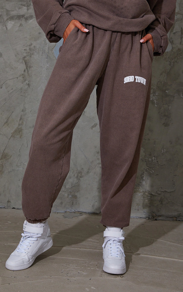 These joggers are sure to be a staple piece in your casual collection. Featuring a chocolate brown material with a 'Soho Town' print and a comfy fit. Team with the matching sweater, simple accessories and chunky kicks.